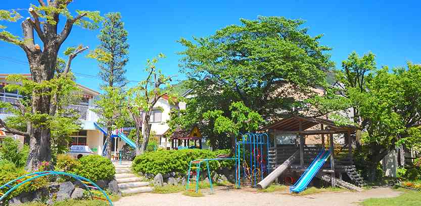 園庭の大きな木々はいつも私たちを見下ろし、見守り、深い根っこで支えてくれています。時には多くの葉で木陰をつくり、休ませてくれます。また季節によっては美味しい実を実らせ、私達のお腹を満たしてくれます。秋になれば紅葉し、じゅうたんを敷き詰めたようなお庭となり、遊び道具に変身します。そんな自然の元で其枝幼稚園の子ども達は、あそびを通して豊かな学びを経験していきます。